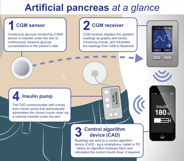 比起奈米膠質,人造胰島機在概念上比較簡單,就是用軟體計算來取代胰臟功能,首先在病人皮下植入一個血糖偵測器,每1到5分鐘測量一次細胞的血糖濃度,把資料傳送給一個專用接收器,接收器再將資料轉送到智慧型手機或平板等行動裝置上,其上專用的app會分析血糖數值,發送訊號給人造胰島機。