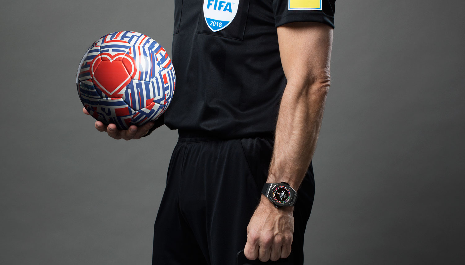 除了球員腳下的智慧足球,跟著滿場跑的裁判手上也戴了一款表──Hublot 推出的 The Big Bang Referee 智慧手錶。