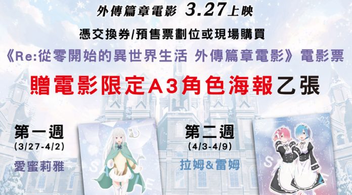 轉載從: 開眼電影網看《Re:從零》外傳篇章電影送限定海報 粉絲高度期待的《Re從零開始的異世界生活 外傳篇章電影》即將在3/27上映!只要看《Re:從零》外傳電影就送「電影限定A3角色海報」,數量有限,送完為止! googletag.cmd.push(function() { googletag.display('div-gpt-ad-1557821465943-0'); }); 粉絲高度期待的《Re從零開始的異世界生活 外傳篇章電影》即將在3/27上映!只要看《Re:從零》外傳電影就送「電影限定A3角色海報」,數量有限,送完為止! 3/27起上映首週是「愛蜜莉雅」款,以《冰結之絆》篇章造型為設計,穿著”絕對領域”膝上襪的"愛蜜莉雅醬"向你奔來,粉絲們還不趕快接住! 4/3上映第二週發送「雷姆拉姆」款,相較於動畫常見的女僕裝款式,以電影另一篇章《Memory Snow》中難得一見的冬裝為設計,怦然心動的”萌袖”新造型,讓你擁有初戀般的感受! 喜歡"愛蜜莉雅醬"、"雷姆拉姆"的粉絲們,得把握好僅限電影期間才收藏到的機會! ...