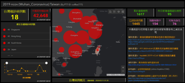 武漢肺炎疫情持續在全球肆虐,為了讓民眾能獲得更及時的國際資訊,PTT 網友 coffee777 利用約翰霍普金斯大學的工具,製作了台灣版的「武漢肺炎戰情儀表版」,提供民眾關於台灣疫情第一手消息。