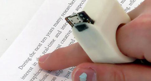 麻省理工學院(MIT)研發一款戴在手上的「手指朗讀機」,形狀酷似大型指環,戴在盲人的手指上隨著指頭在書本與電腦上滑動,就能辨識出字形並大聲朗讀出來,對於失明者可說是一大幅音,不再需要依靠點字書才能閱讀。